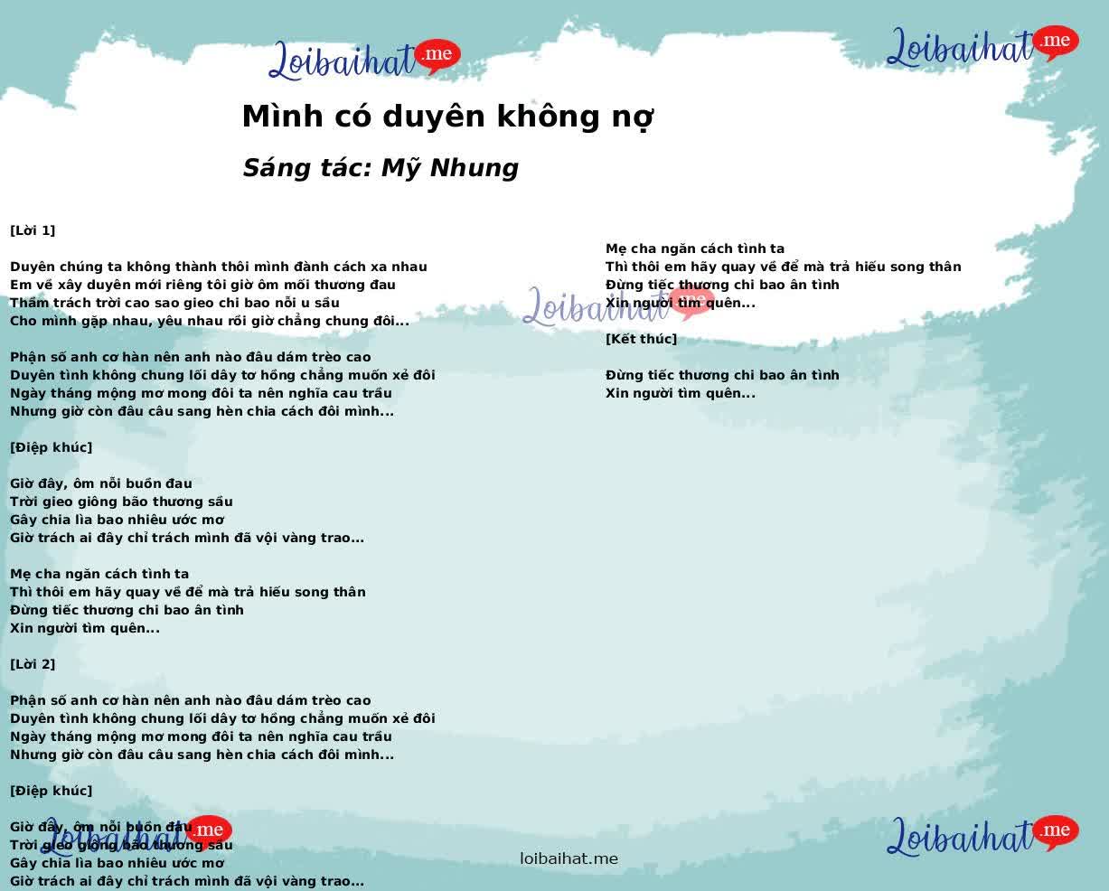 - Mình có duyên không nợ - Nhạc sĩ Mỹ Nhung[Lời 1] Duyên chúng ta không thành thôi mình đành cách xa nhau Em về xây duyên mới riêng tôi giờ ...