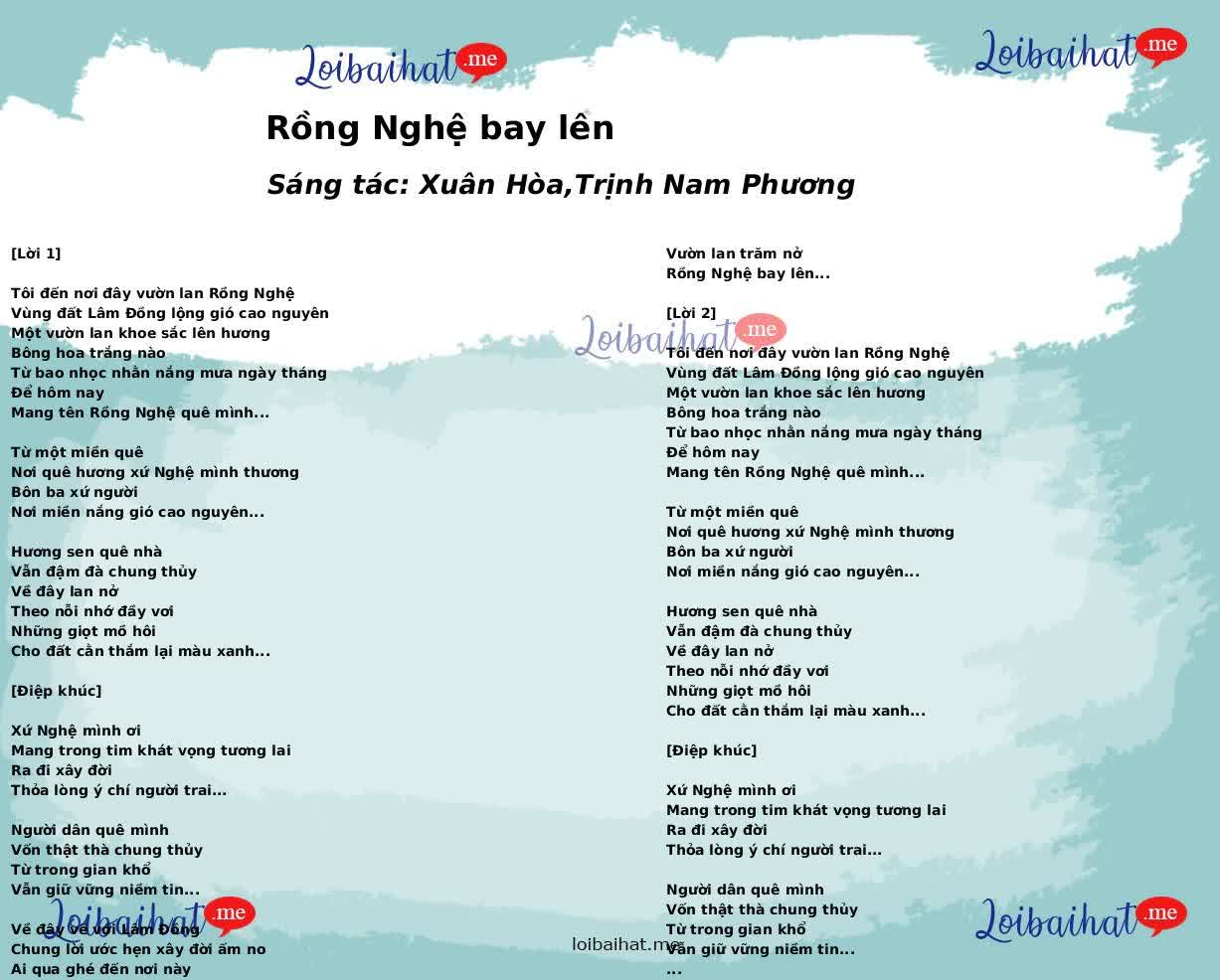 - Rồng Nghệ bay lên - Nhạc sĩ Xuân Hòa,Trịnh Nam Phương[Lời 1] Tôi đến nơi đây vườn lan Rồng Nghệ Vùng đất Lâm Đồng lộng gió cao nguyên Một vườn lan...